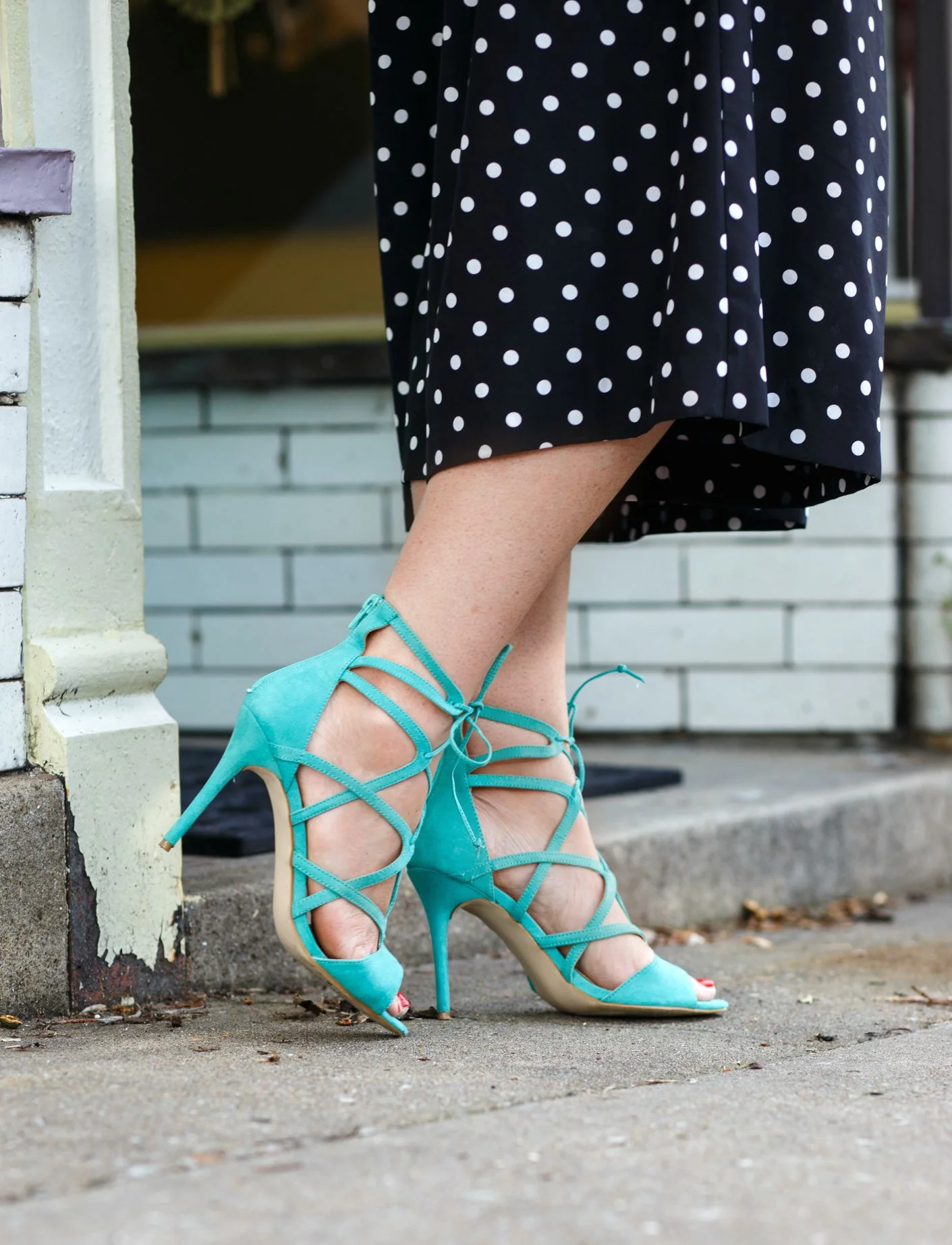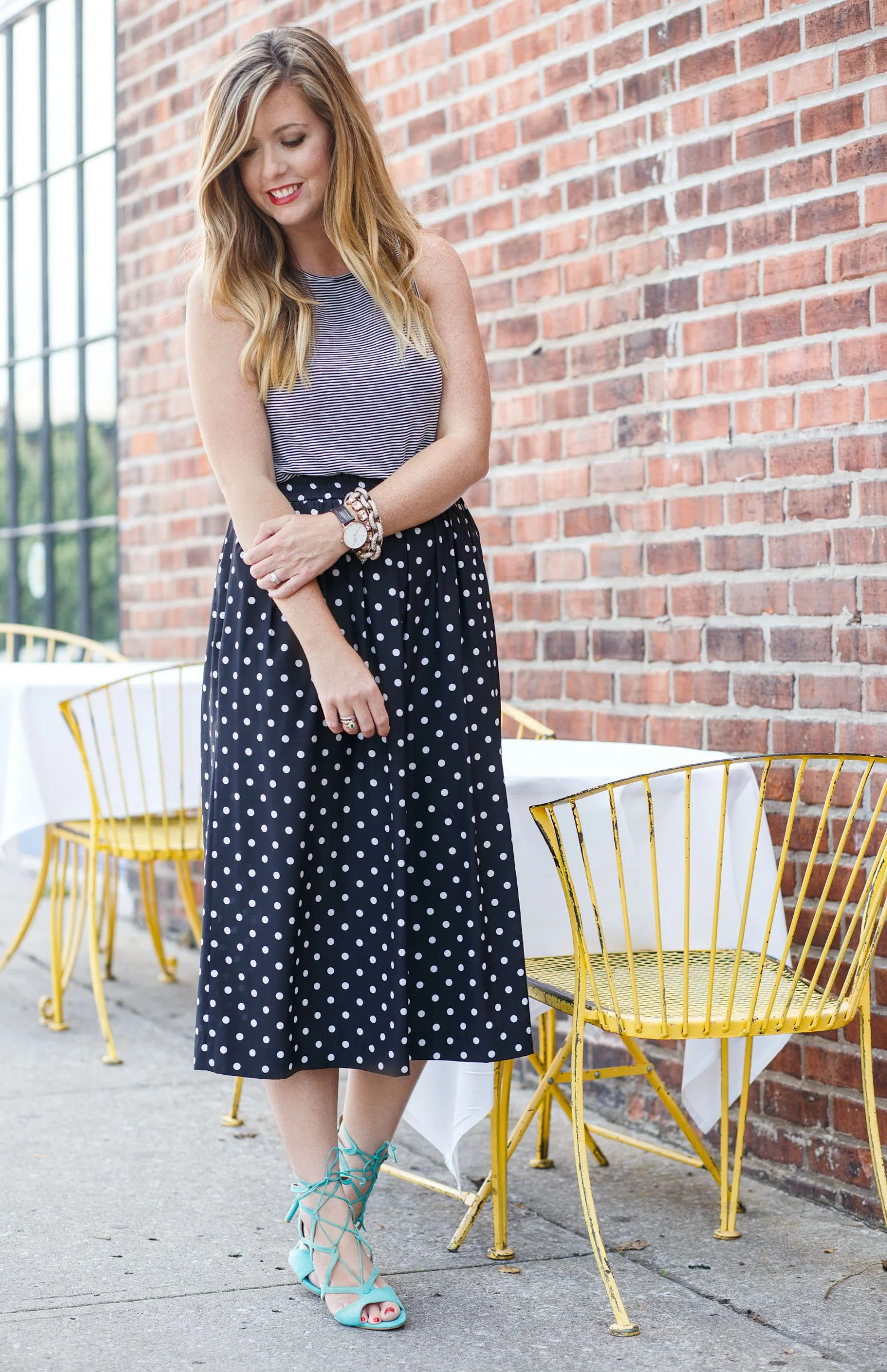Old Navy tank, Thrifted polka dot culottes, Just Fab strappy sandals, Loren Hope earrings c/o Rocksbox, J.Crew bracelet, J.Crew bracelet, and Daniel Wellington watch