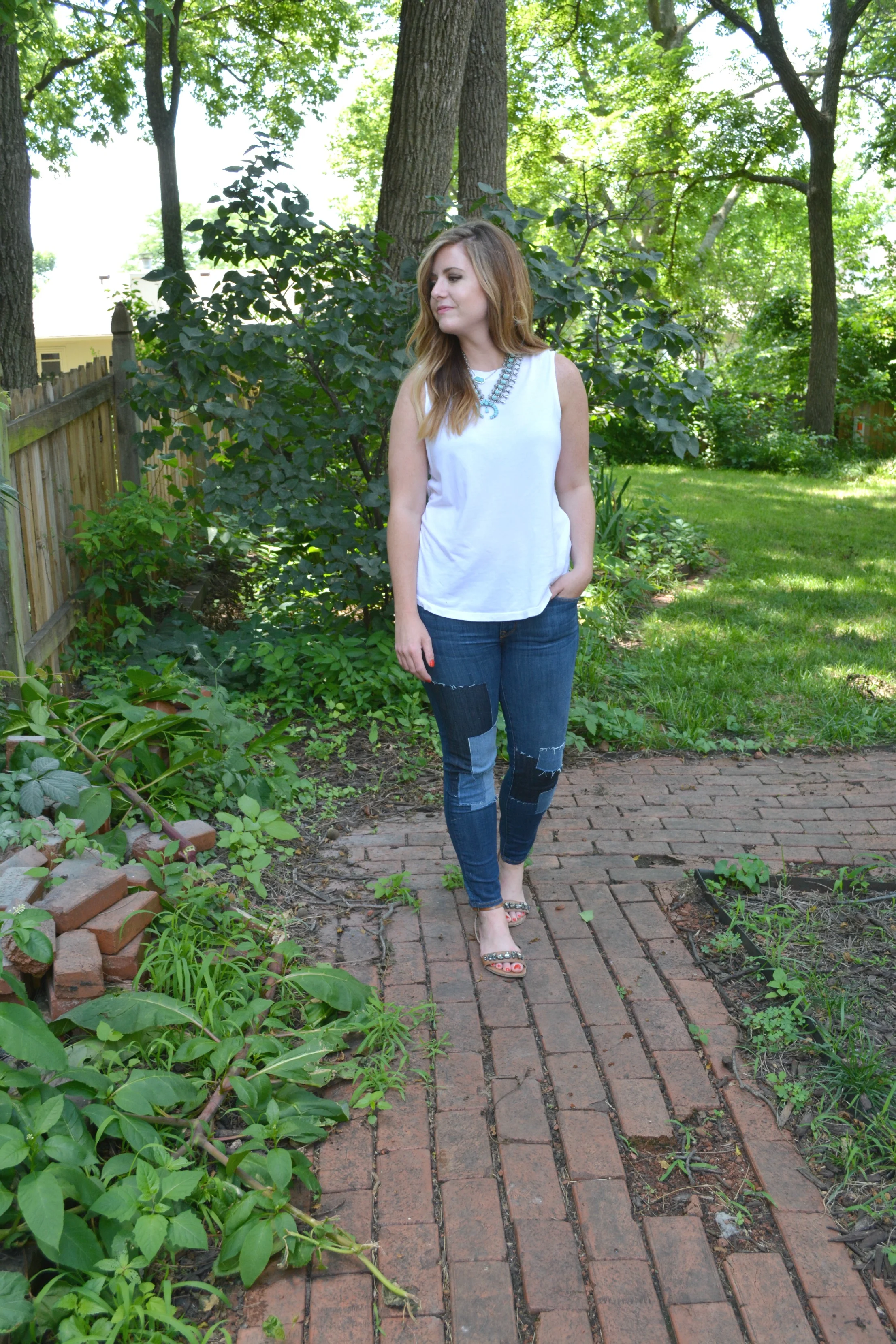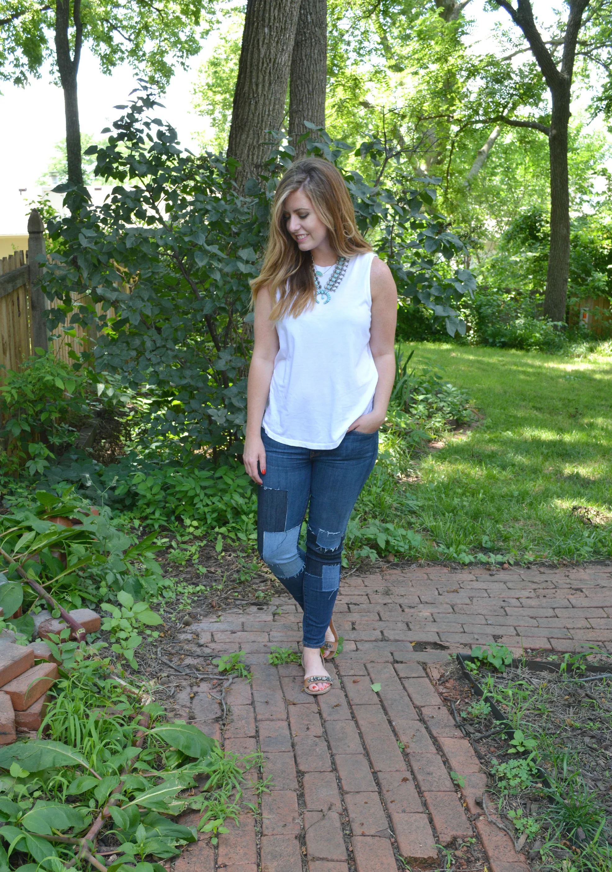 Bauble Bar Capri Amulet necklace, Kendra necklace c/o, Baldwin muscle tank, Baldwin jeans, and Target sandals